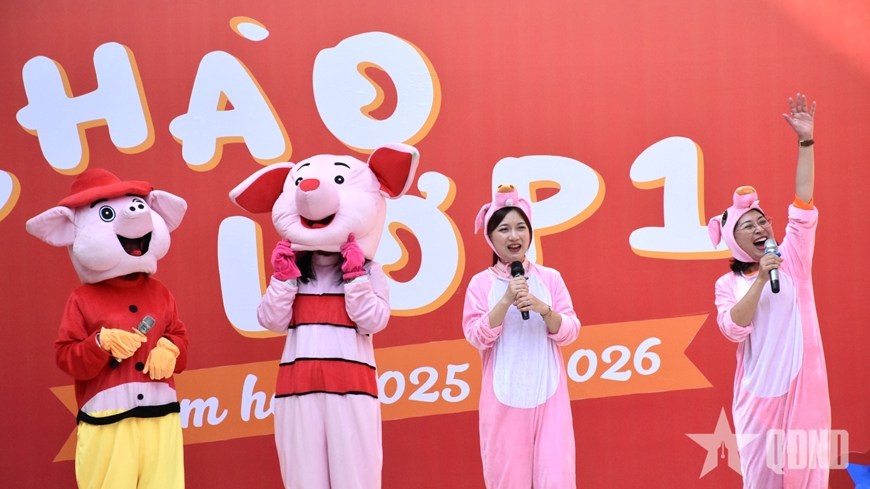 | Giáo viên Trường Tiểu học Tân Định vào vai các chú heo con trong câu chuyện "Ba chú heo con" gửi đến các học sinh lớp 1 những bài học ý nghĩa. Ảnh: THU HÒA |