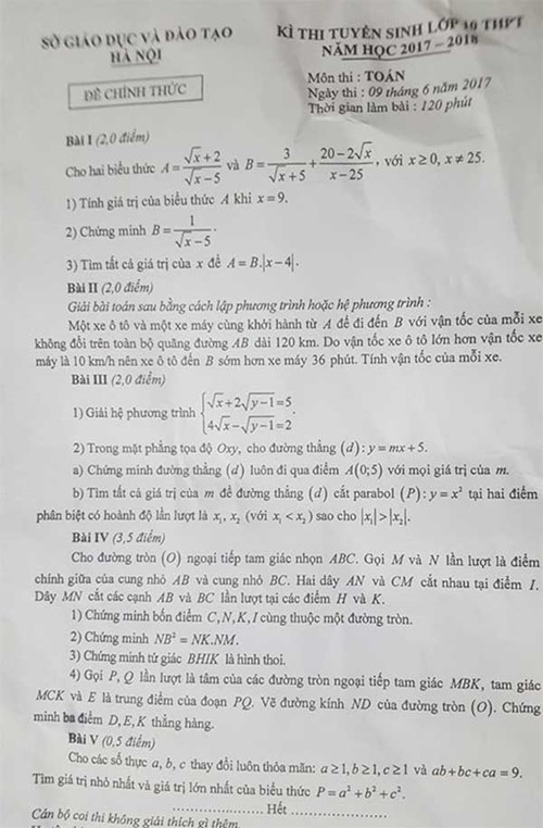 QĐND Online – Chiều 9-6, học sinh tham gia kỳ thi vào lớp 10 do Sở Giáo dục và Đào tạo Hà Nội tổ chức, làm bài thi môn Toán, thời gian 120 phút.