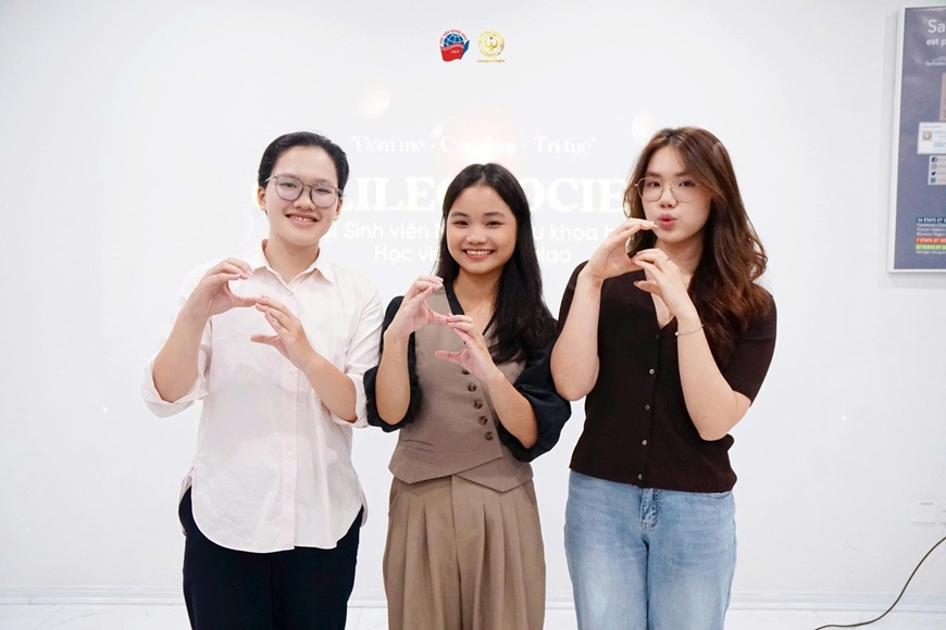 | Nguyễn Thị Thùy Trang (đứng giữa), Chủ nhiệm Hội sinh viên Nghiên cứu khoa học - Học viện Ngoại giao, nhiệm kỳ 2025 - 2026. Ảnh: Galileo Society |