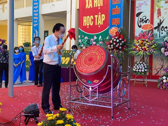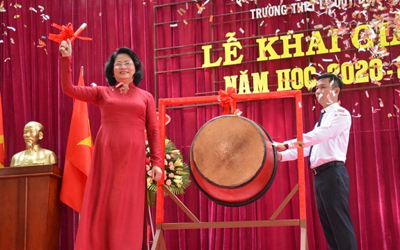 Đồng chí Đặng Thị Ngọc Thịnh tới dự và đánh trống khai trường tại Trường THPT Lê Quý Đôn. Ảnh: Lê Cúc |