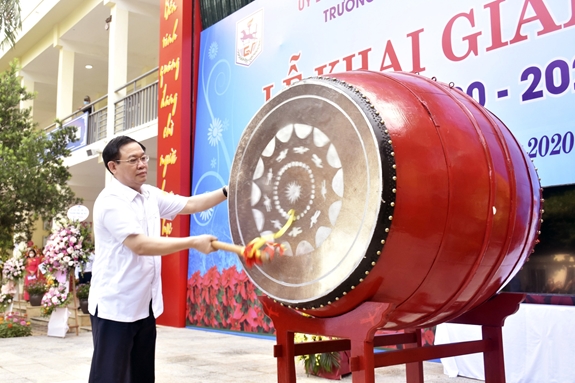 Đồng chí Bí thư Thành ủy Hà Nội Vương Đình Huệ đánh trống khai giảng năm học mới. Ảnh: Trung Tâm |