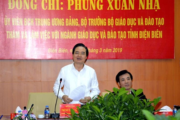 Về cơ sở vật chất, Bộ trưởng Phùng Xuân Nhạ đề nghị tỉnh Điện Biên có lộ trình để thực hiện đầu tư cơ sở vật chất, trước hết cho bậc tiểu học, bảo đảm 100% học sinh lớp 1 được học 2 buổi/ngày, từng bước giảm dần trường tạm, lớp tạm, giãn sĩ số học sinh/lớp.