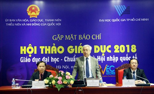 Sáng 13-4, Ủy ban Văn hóa, Giáo dục, Thanh niên, Thiếu niên và Nhi đồng của Quốc hội phối hợp Đại học Quốc gia TP Hồ Chí Minh tổ chức gặp mặt báo chí thông tin về Hội thảo giáo dục năm 2018 với chủ đề “Giáo dục đại học - chuẩn hóa và hội nhập quốc tế”, sẽ diễn ra vào tháng 8-2018 tại Hà Nội.