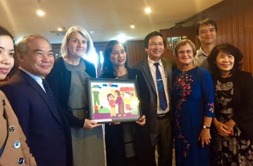 Thứ trưởng Bộ GD-ĐT Nguyễn Vinh Hiển cùng Đại sứ Đan Mạch tại Việt Nam bà Charlotte Laursen (thứ hai và ba từ trái sang) và các đại biểu chụp ảnh tại lễ tổng kết