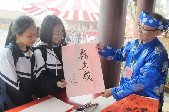 Các em thích thú khi được tặng thư pháp trong dịp đầu năm mới. |