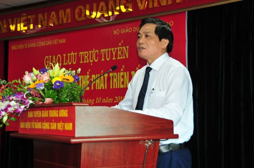 Thứ trưởng Bộ GD-ĐT Nguyễn Văn Phúc phát biểu tại buổi giao lưu trực tuyến. |