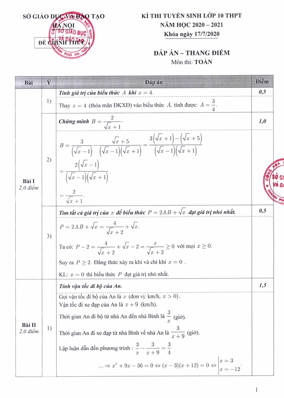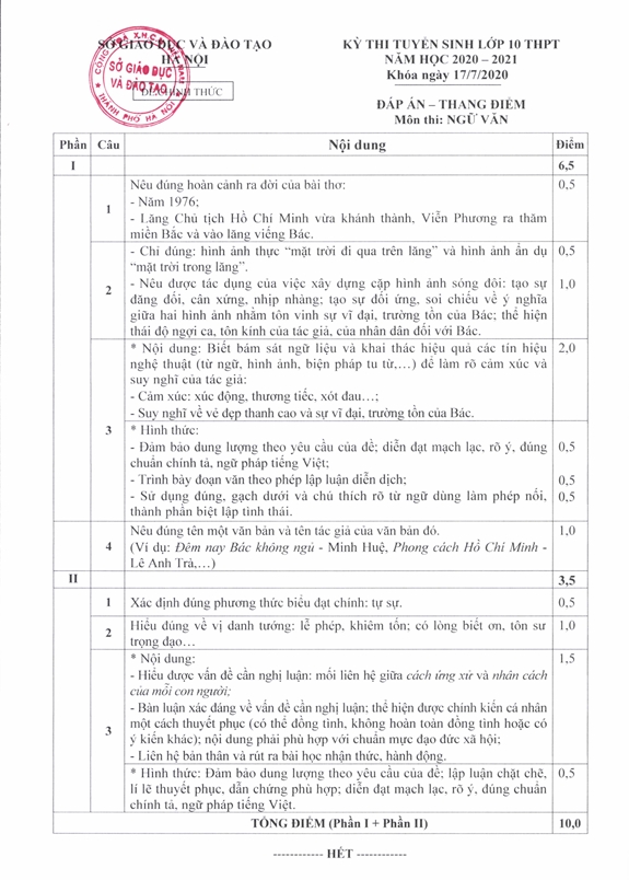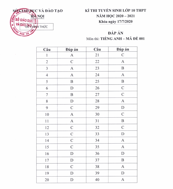 Ngày 23-7, Sở Giáo dục và Đào tạo Hà Nội đã công bố đáp án và thang điểm các bài thi trong kỳ thi tuyển sinh lớp 10 trung học phổ thông công lập năm học 2020-2021 tại Hà Nội.