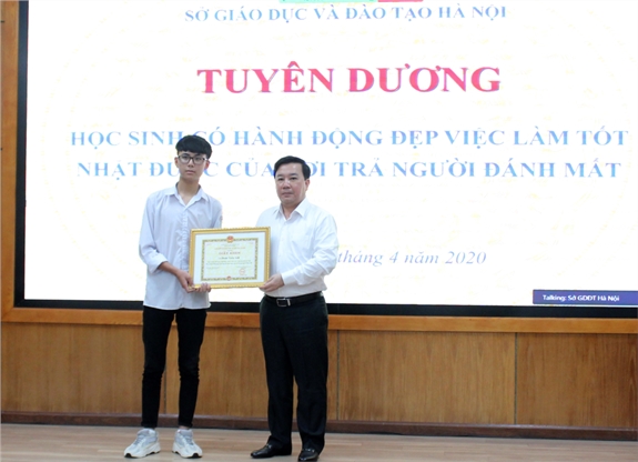 Cũng tại buổi lễ, Sở GD-ĐT Hà Nội đã tuyên dương học sinh Đoàn Tuấn Anh (lớp 10A3, trường THPT Vân Cốc, huyện Phúc Thọ), đã có hành động đẹp nhặt được của rơi trả lại người đánh mất.