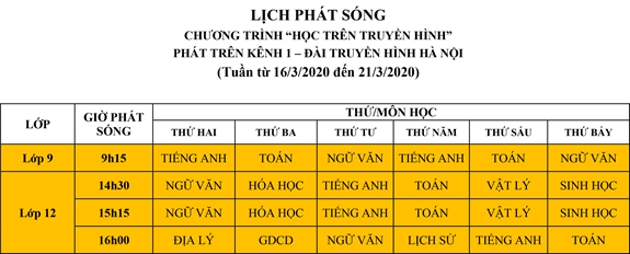 Lịch phát sóng từ 16-3 đến 21-3 cho học sinh lớp 9 và 12. |