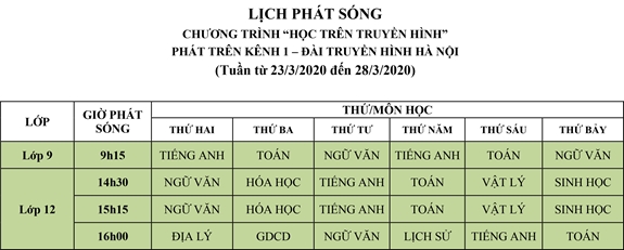 Lịch phát sóng từ 23-3 đến 28-3 cho học sinh lớp 9 và 12. |