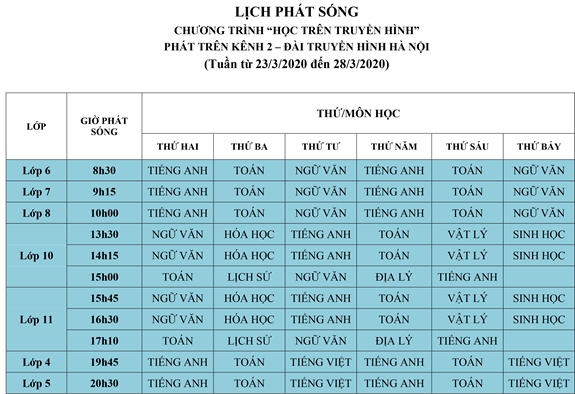 Lịch phát sóng từ 23-3 đến 28-3 cho học sinh lớp 4, 5, 6, 7, 8 và 10, 11. |