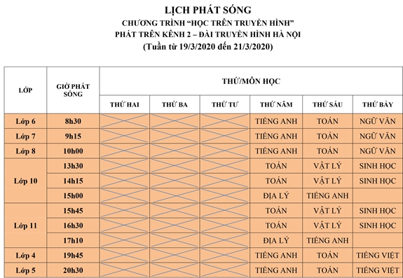 Lịch phát sóng từ 19-3 đến 21-3 cho học sinh lớp 4, 5, 6, 7, 8 và 10, 11. |