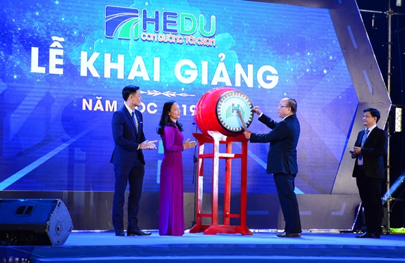 Lãnh đạo Trường Đại học Văn Hiến đánh trống khai giảng năm học mới. |