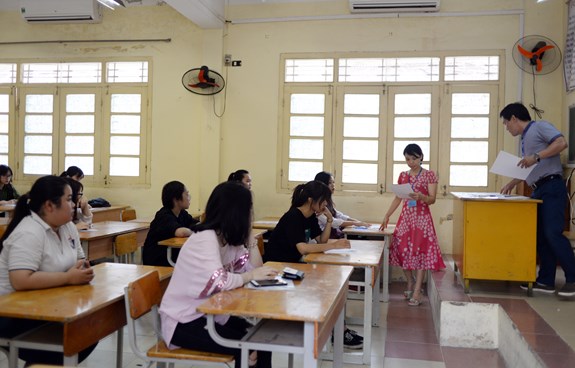 QĐND Online - Sáng 24-6, 2.144 điểm thi THPT quốc gia năm 2018 trên cả nước đã tổ chức họp cán bộ làm công tác coi thi. Dù đã được tập huấn kỹ về công tác coi thi, nhưng trong sáng 24-6, những điểm mới, lưu ý về quy chế, lưu ý về trách nhiệm của cán bộ coi thi, lưu ý về công tác coi thi vẫn được tiếp tục quán triệt. Ghi nhận tại điểm thi THPT quốc gia Trường THPT Việt Đức (cụm thi Sở GD-ĐT Hà Nội), cụm thi đã chuẩn bị cho mỗi giám thị một bộ tài liệu phổ biến tại phòng thi.