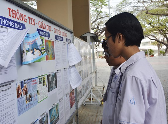 Học sinh Trường THPT Xuyên Mộc tham quan bảng tin tuyên truyền tác hại của hút thuốc lá. |