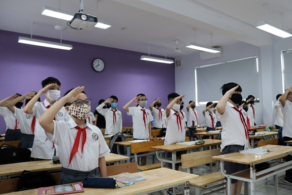Học sinh Trường THCS Nhật Tân (Hà Nội) thực hiện tiết chào cờ trên lớp. Ảnh minh họa. |