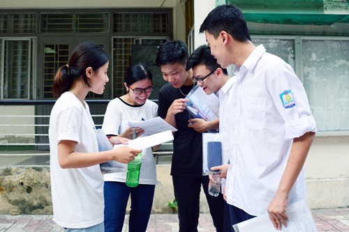 Thí sinh trao đổi bài sau khi kết thúc buổi thi môn Hóa học tại điểm thi Viện Đào tạo liên tục, Trường ĐH Bách khoa Hà Nội.