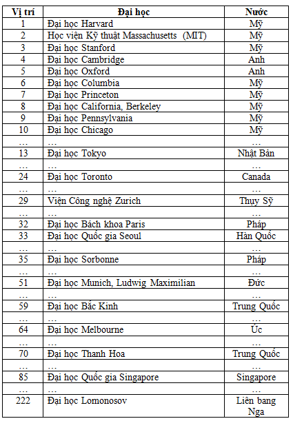 4 ĐH của Việt Nam có tên trên bảng xếp hạng này gồm: