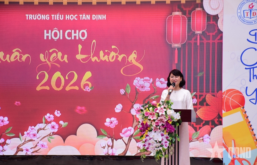 | Tiến sĩ Hoàng Thúy Nga, Hiệu trưởng Trường Tiểu học Tân Định chia sẻ về ý nghĩa của Hội chợ "Xuân yêu thương". |