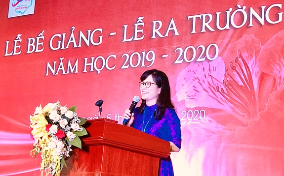 cô Hiệu trưởng Nguyễn Thị Thu Anh nhắn nhủ học trò tại lễ bế giảng. |