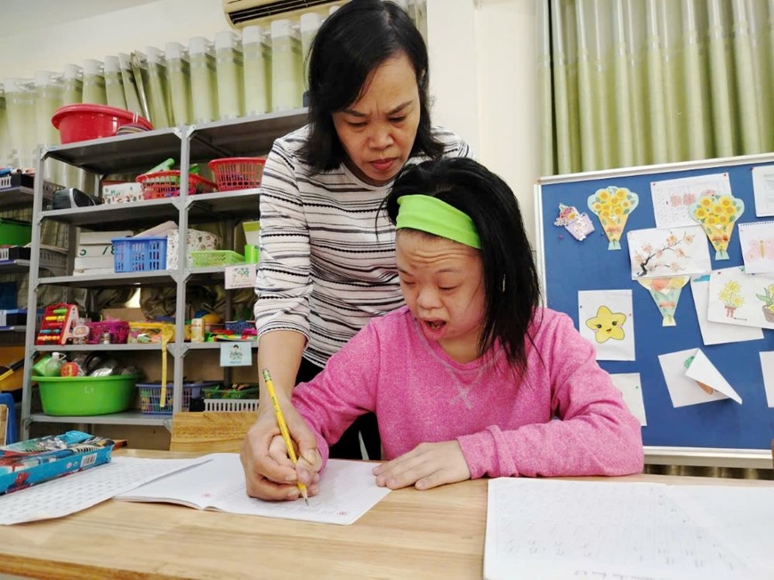 | Cô giáo Nguyễn Thị Oanh, chủ nhiệm Lớp Giáo dục đặc biệt 1 hướng dẫn em Đỗ Phương Dung từng nét chữ. |