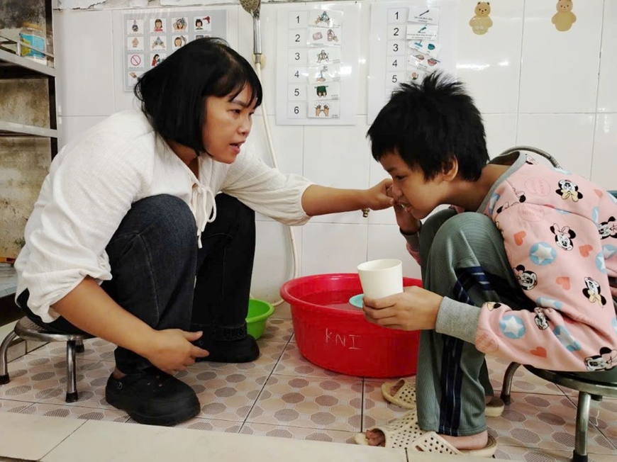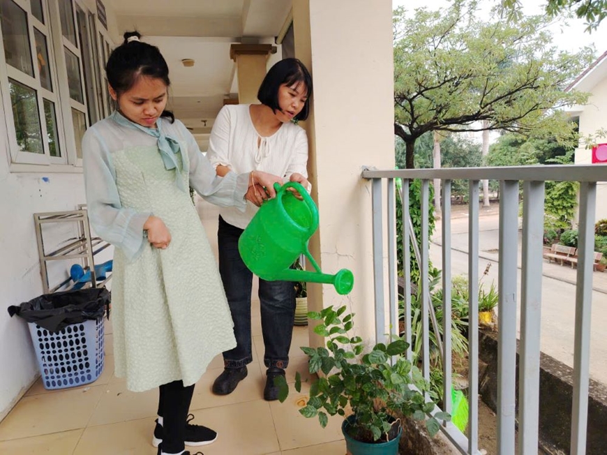 | Các cô giáo không chỉ dạy chữ, dạy nghề mà còn hướng dẫn các em từng việc nhỏ như vệ sinh cá nhân, tưới cây, lau dọn nhà... |