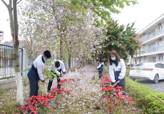 | Học sinh Trường THPT Phúc Lợi chăm sóc cảnh quan trong khuôn viên nhà trường. |