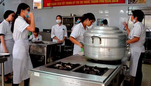 Học sinh 9+ tập làm bánh tại Trường Trung cấp Nghề nấu ăn-Nghiệp vụ Du lịch và Thời trang Hà Nội. |