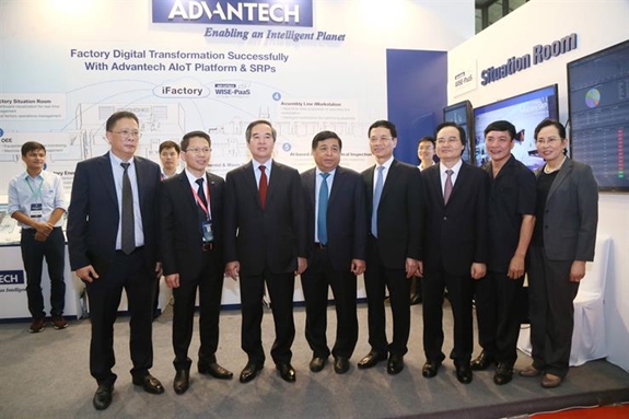 Đồng chí Nguyễn Văn Bình và các đại biểu dự Triển lãm quốc tế về công nghiệp 4.0. |