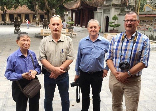 Nhà giáo Nhân dân Nguyễn Đức Thìn (ngoài cùng, bên trái) chụp ảnh lưu niệm với các du khách nước ngoài đến tham quan Đền Đô (Bắc Ninh). Ảnh: Hoàng Nguyễn.