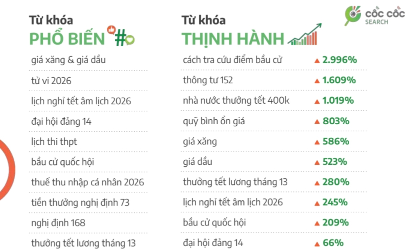Trong tháng 1-2026, sự chú ý của người dân cả nước đổ dồn về Đại hội đại biểu toàn quốc lần thứ XIV của Đảng kéo theo hàng loạt từ khóa liên quan tăng mạnh như “bầu cử quốc hội” tăng 209% và “đại hội đảng 14” tăng 66%. Các từ khóa mang tính hướng dẫn như “cách tra cứu điểm bầu cử” tăng tới 2.996%, phản ánh sự chủ động của người dân trong việc nắm bắt quy trình và phương thức thực hiện quyền lợi bầu cử.