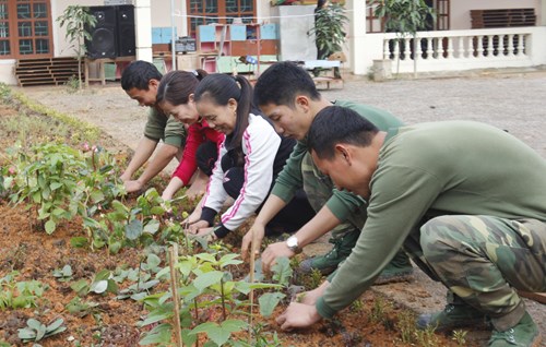 Bộ đội Trung đoàn 1 cùng giáo viên Trường Mầm non xã Giang Sơn Tây trồng hoa. |