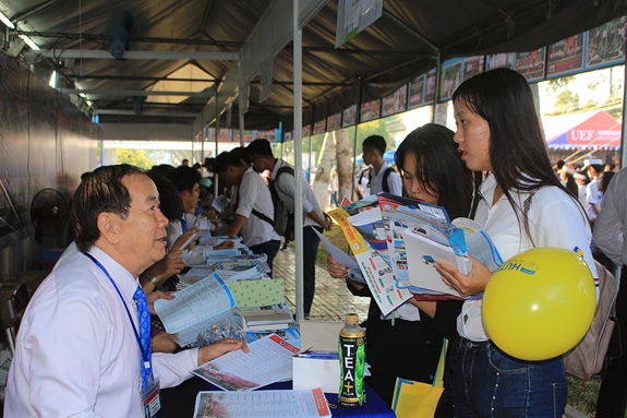 Các thí sinh được Ban tổ chức nhiệt tình giải đáp thắc mắc liên quan đến ngành nghề hướng nghiệp. |