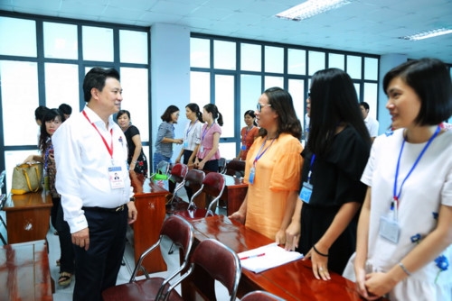 Thứ trưởng Nguyễn Hữu Độ chia sẻ, động viên với các cán bộ coi thi tại điểm thi Trường THPT chuyên Biên Hòa – Hội đồng thi Sở GD-ĐT Hà Nam.