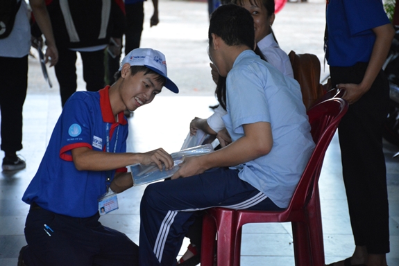 Đội tiếp sức mùa thi giúp đỡ các thí sinh khuyết tật rời phòng thi tại điểm thi THCS Colette. |