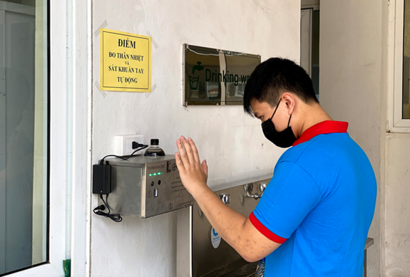 Máy đo thân nhiệt và sát khuẩn tay tự động tại Trường ĐH Bách khoa Hà Nội: Ảnh: Hồng Hạnh. |