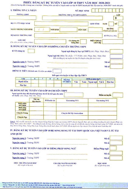 Mỗi học sinh các trường trung học cơ sở, trung tâm giáo dục nghề nghiệp - giáo dục thường xuyên quận, huyện, thị xã thuộc thành phố Hà Nội sẽ được nhà trường có trách nhiệm phát “Phiếu đăng ký dự tuyển vào lớp 10 trung học phổ thông năm học 2020-2021”.
