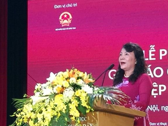 Thứ trưởng Bộ GD-ĐT Nguyễn Thị Nghĩa phát biểu tại lễ phát động. |