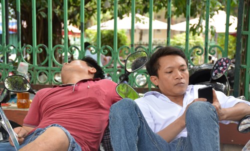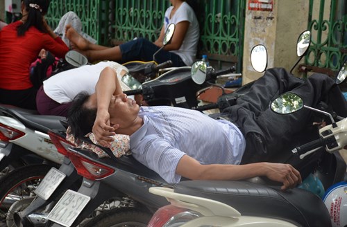 Xe máy trở thành chiếc giường di động giúp phụ huynh tranh thủ những giấc ngủ "vội" trong khi chờ con thi.