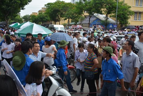 Cổng Trường Học viện Kỹ thuật Quân sự ken chặt người nhà thí sinh chờ con ngoài phòng thi.