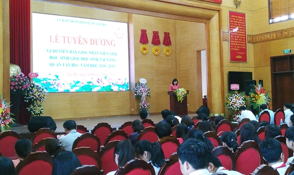 Quang cảnh lễ tuyên dương và khen thưởng giáo viên, nhân viên, học sinh giỏi quận Tây Hồ. |