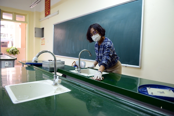 | Phòng thí nghiệm được thầy cô khử khuẩn an toàn, chờ đón học sinh trở lại trường học. |
