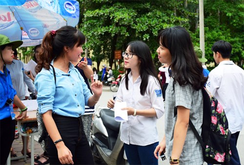 Thí sinh tại cụm thi Đại học Sư phạm Hà Nội trao đổi sau khi hoàn thành bài thi.