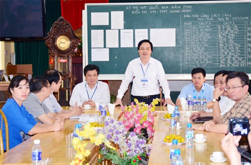 Bộ trưởng Bộ Giáo dục và Đào tạo Phùng Xuân Nhạ cùng đoàn công tác kiểm tra kỳ thi THPT quốc gia 2016 tại điểm thi Trường THPT Quang Minh (huyện Mê Linh, Hà Nội).
