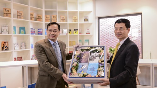 | Thiếu tướng Nguyễn Mạnh Hùng (bên phải), Ủy viên Trung ương Đảng, Tổng giám đốc Viettel tặng thư viện học viện những bộ sách quý. |