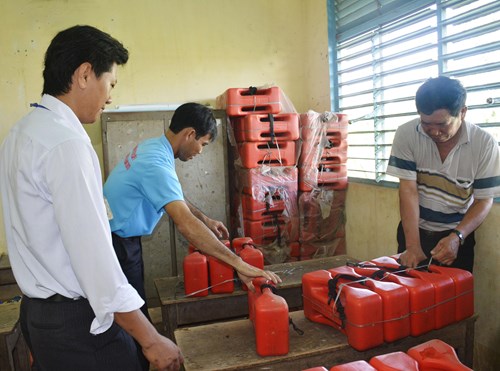 Giáo viên Trường Tiểu học A Tân An kiểm tra phương tiện cứu sinh sẵn sàng cho mùa lũ.