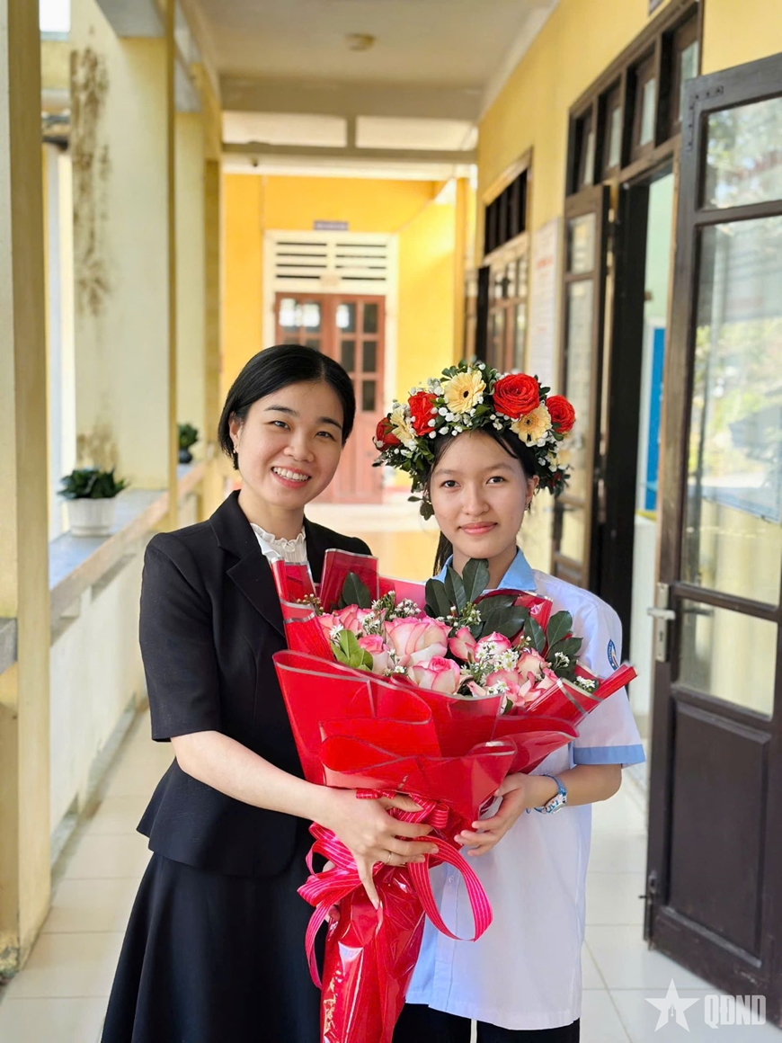 | Em Võ Toàn Minh Thư (bên phải) nhận hoa chúc mừng từ cô giáo sau khi xuất sắc giành vị trí cao nhất tại cuộc thi điểm cầu Huế. |