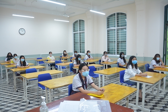 Về quy định giãn cách trong phòng thi, mỗi phòng thi bố trí 24 thí sinh. Sở GD&ĐT thành phố đã yêu cầu các điểm thi bố trí sơ đồ chỗ ngồi cho thí sinh bảo đảm quy định giãn cách tối đa giữa hai thí sinh. Năm nay, do thực hiện công tác phòng, chống dịch Covid-19, các điểm thi không tổ chức khai mạc, không tập trung thí sinh ở sân trường. Thí sinh có mặt trước giờ thi 30 phút. Cán bộ coi thi có mặt tại điểm thi lúc 6 giờ 30 phút (buổi sáng). Khi đến điểm thi, thí sinh sẽ được đo thân nhiệt, rửa tay sát khuẩn, yêu cầu đeo khẩu trang và hướng dẫn lên phòng thi.