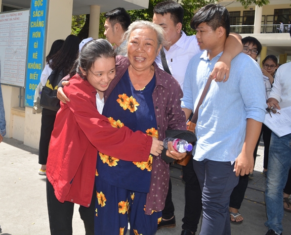 Thí sinh vui mừng vì được người thân đón trước cổng trường. |