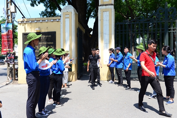 Dù thời tiết nóng bức nhưng không khí trường thi khá vui vẻ. |